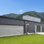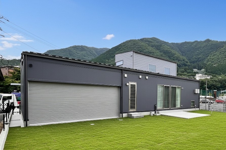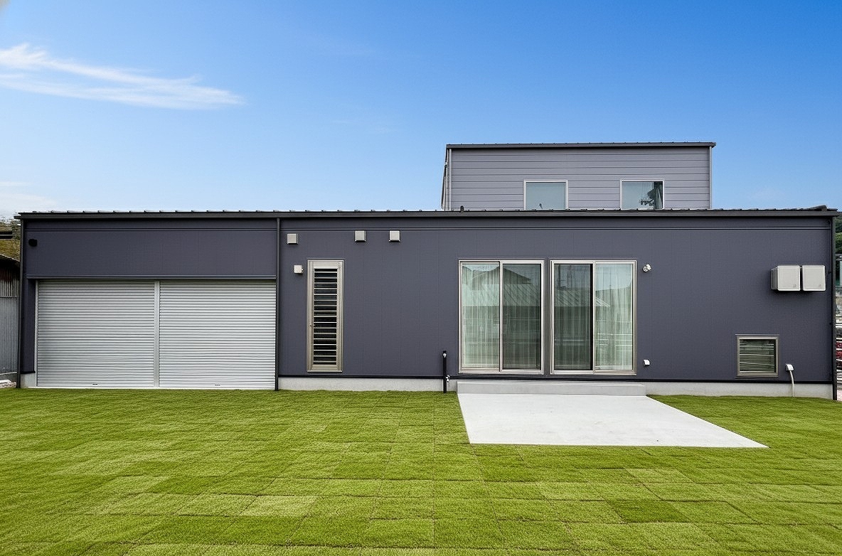 緑と空に映える、グレーの外観