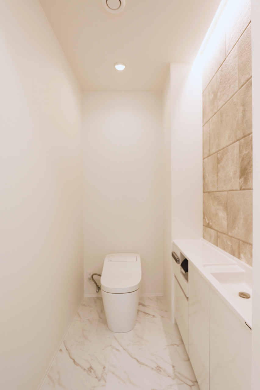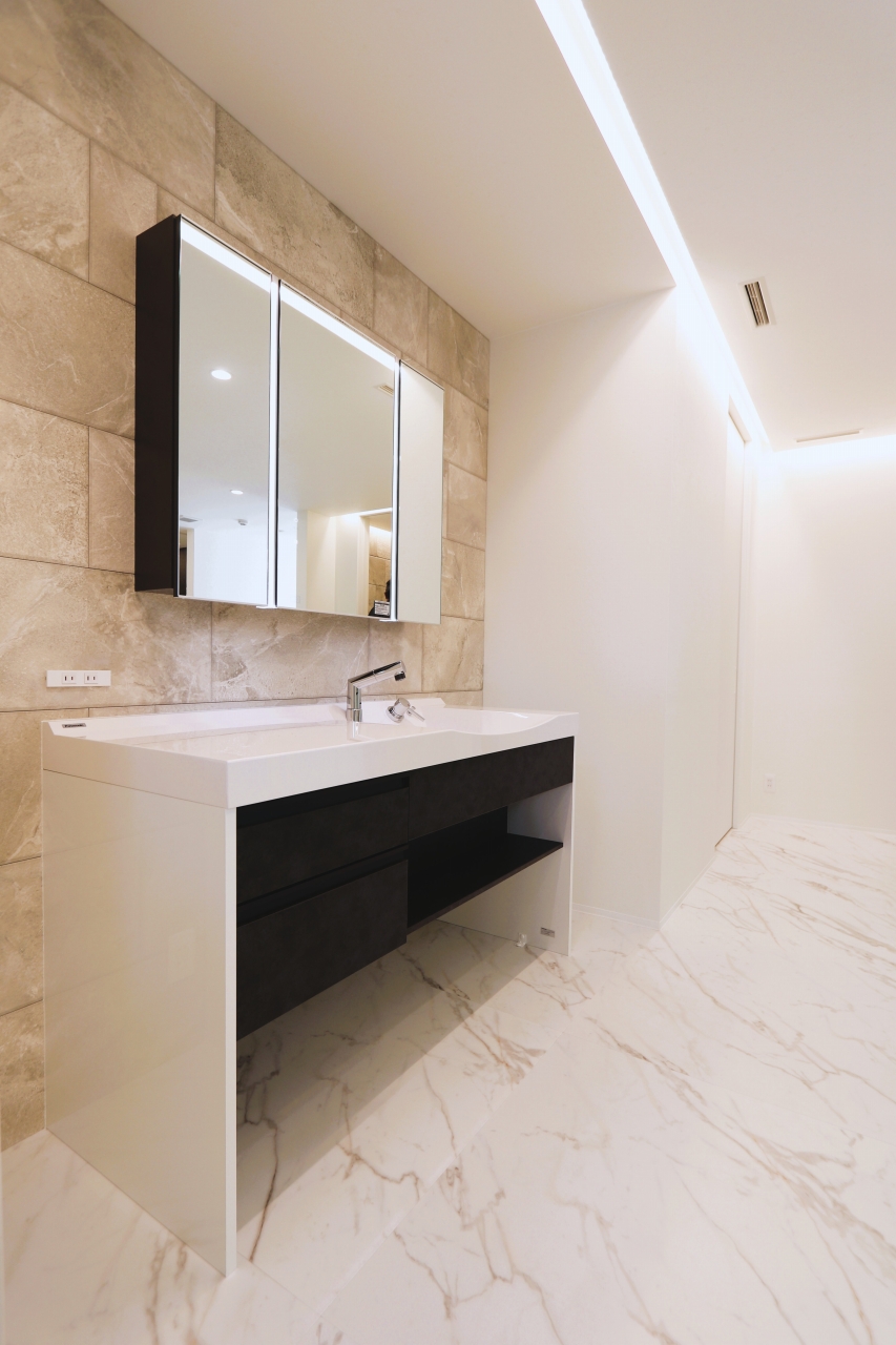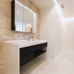 落ち着きあるカラーで統一されたシンプルモダンな洗面所